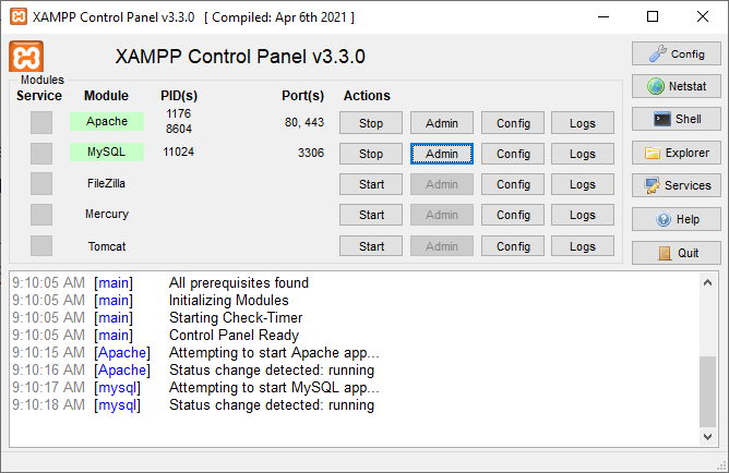In the XAMPP control panel, click on ‘Admin‘ under the MySQL actions. This will open phpMyAdmin.
